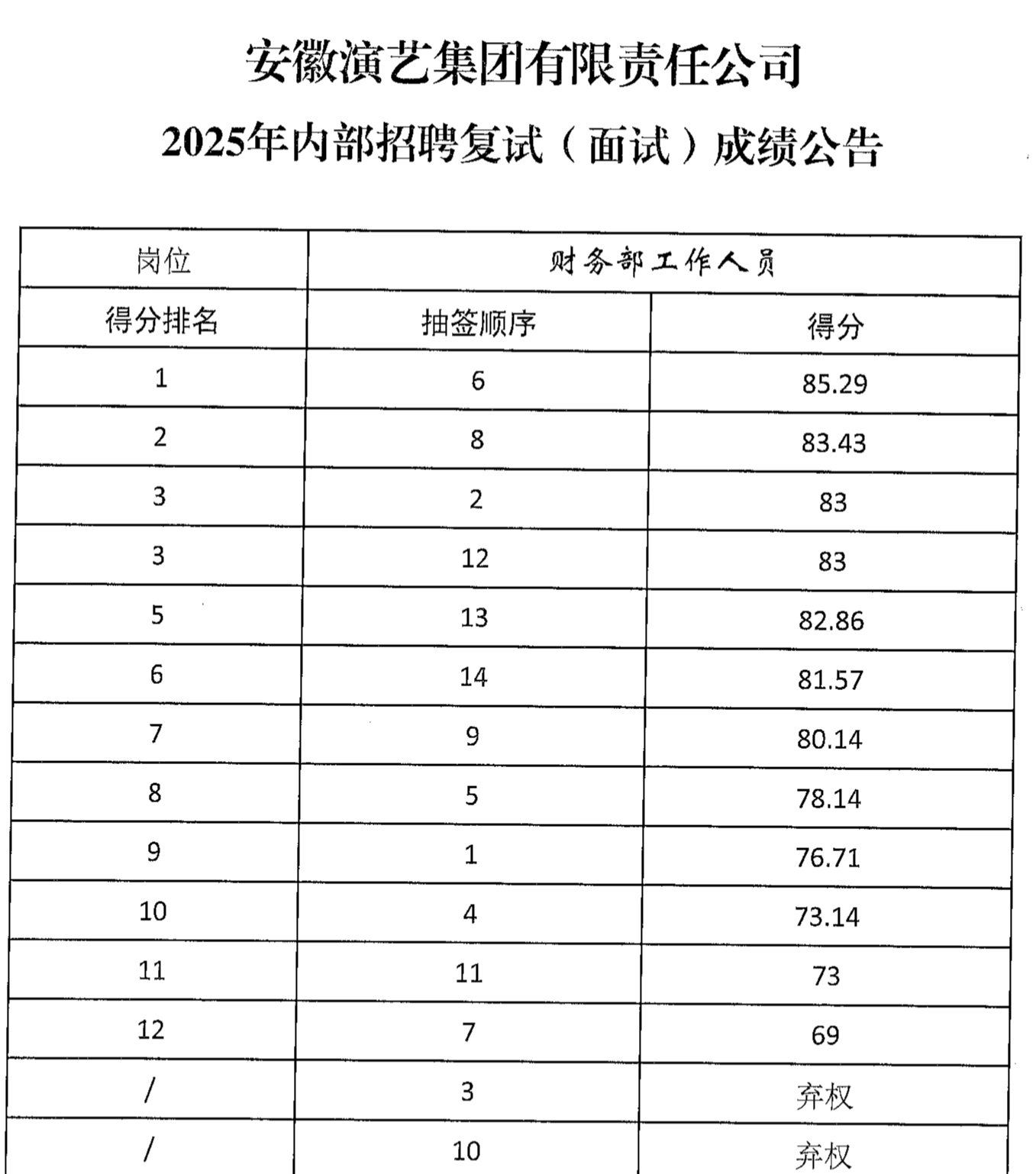 2025年内部招聘复试(面试)成绩公告