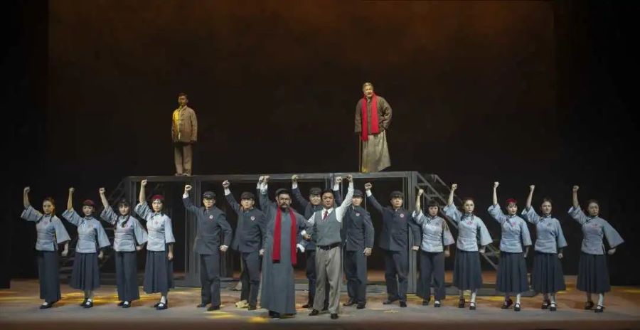 大幕打开,一组“五四运动”的雕像庄严而辉煌。老年陈独秀凝视着雕像,心潮翻涌,进而引发了当年波诡云谲的情景呈现和他的跌宕起伏的人生感慨。