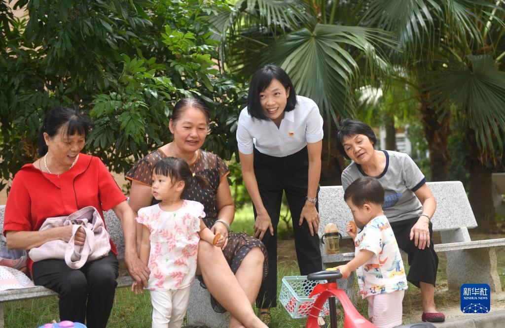 二十大代表、广东省佛山市禅城区古灶村党委书记、村委会主任陆秀兴(右三)和村民在一起聊天(2022年9月7日摄)。新华社记者 卢汉欣 摄